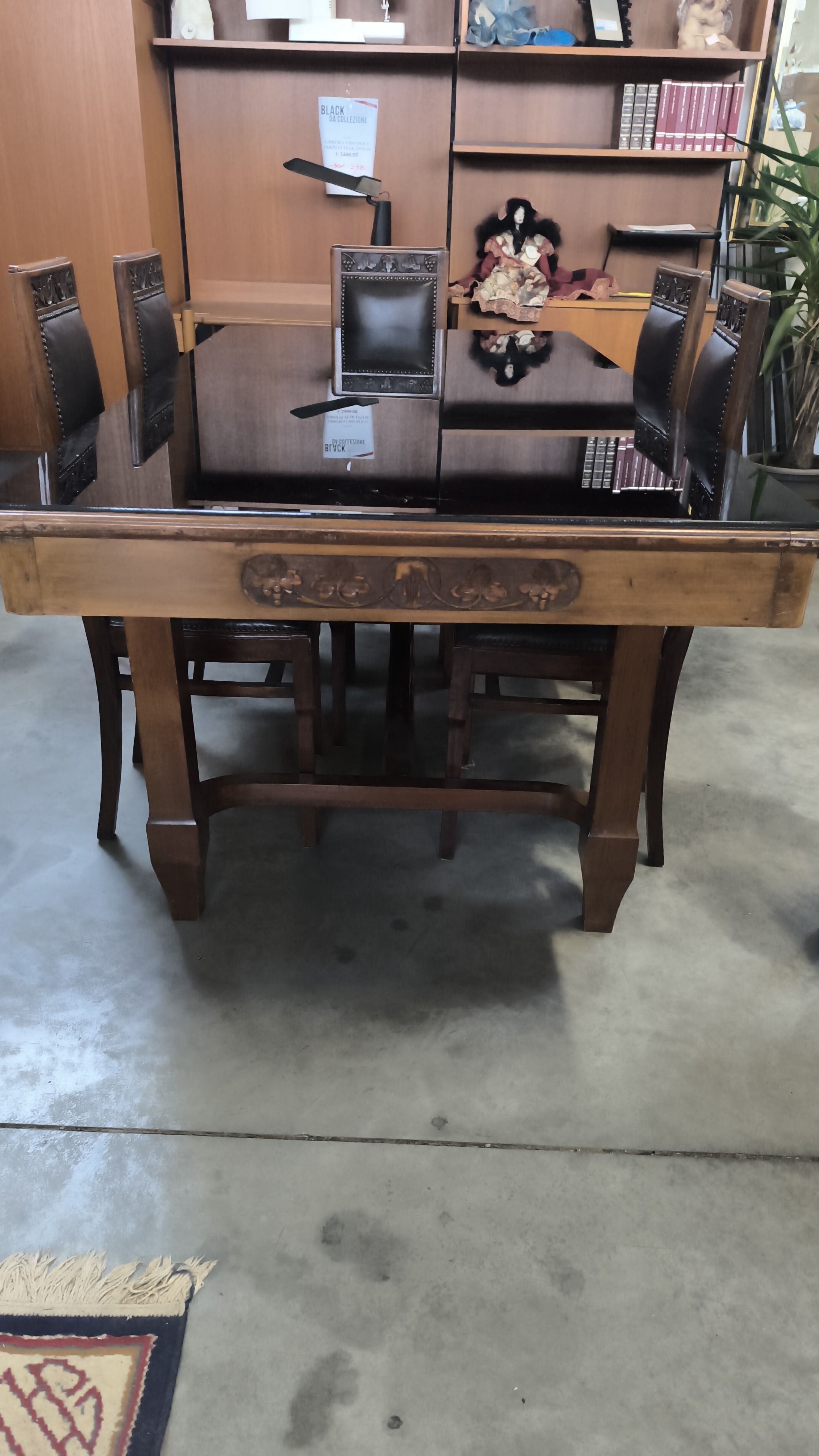 Tavolo anni 50.con dis intagliati a mano e piano in vetro