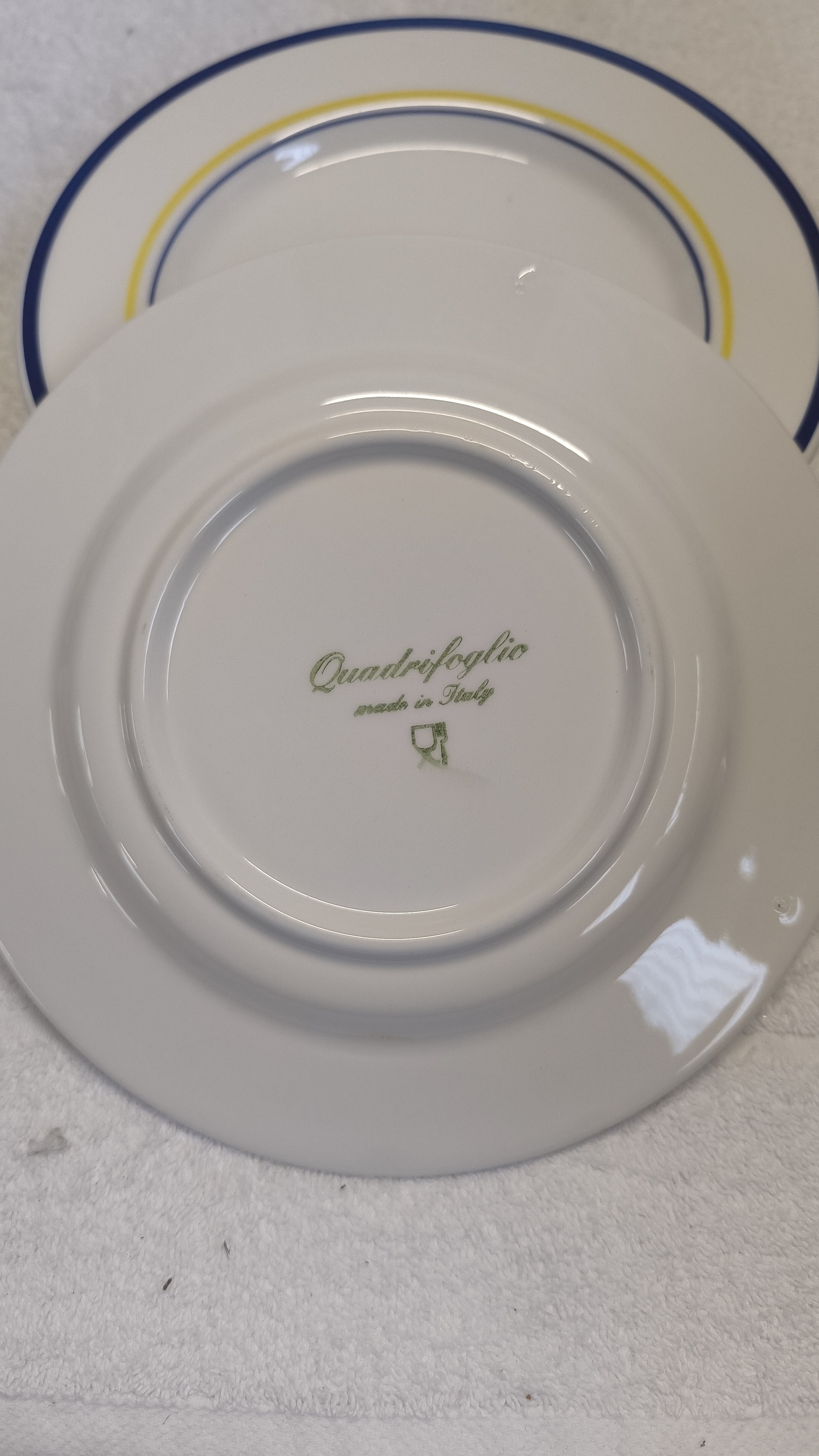 Quattro piatti con bordo blu e giallo